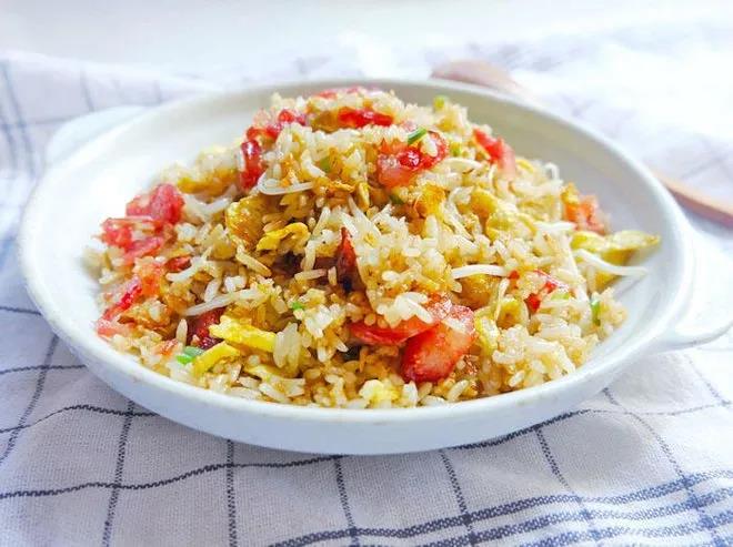 锅圈食汇天味香肠1包、贡菜1包、鸡蛋、葱花、盐、调味料、大米